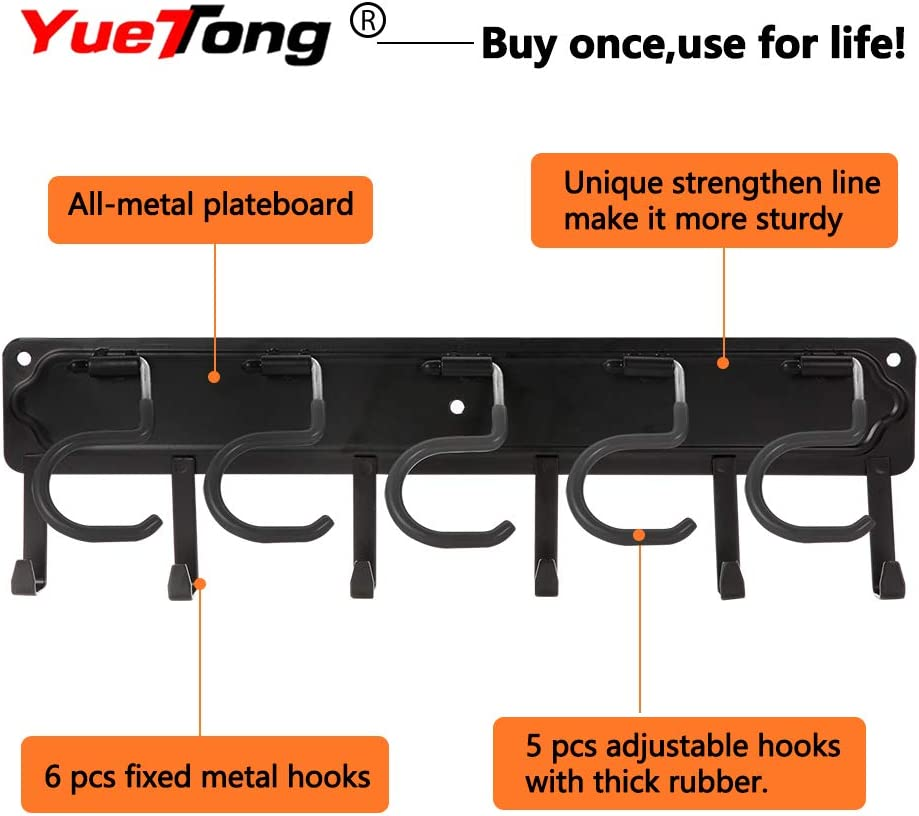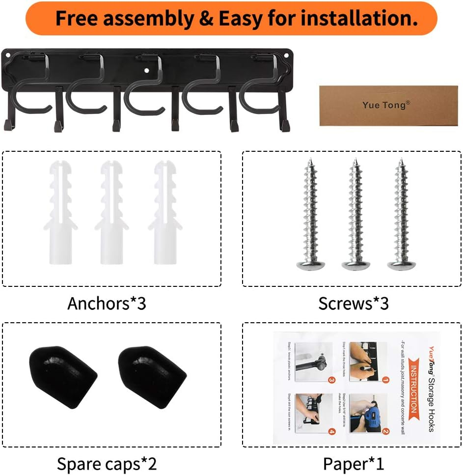 - 【Free Assemble】YueTong wall mounted broom holder you get will be a whole body with hooks assembled,so you can install it directly with the recommended drill size according to the installation paper.