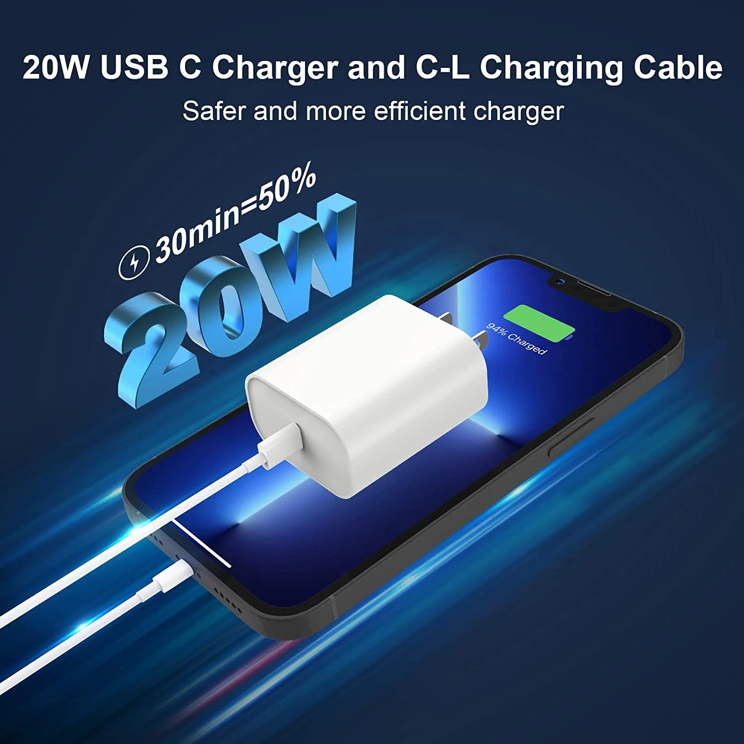 - 【20W iPhone Charger Fast Charging】 Equipped with a USB C port, PD 3.0 20W USB-C fast charger with 6ft type c to lightning cable provides Max 20W output power. This 20W USB-C iPhone chargers charge your new iPhone 14 13 12 11 up to 50% in just 30 minutes, 3X fast then 5W charger which saves more than 1 hour for you.