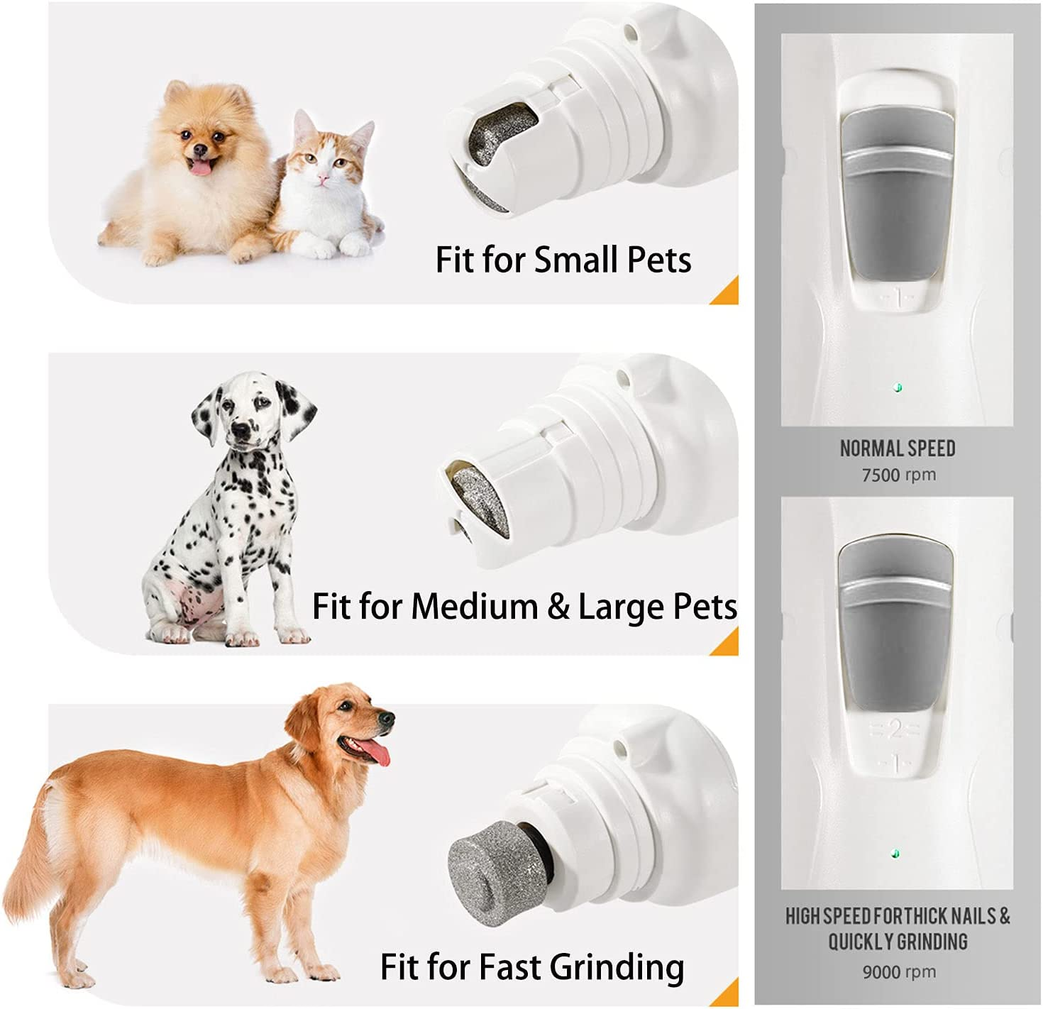 2 Speed (7500/9000 rpm) and 3 ports are available for small, medium, and large pets, such as Dogs, Cats, Guinea Pigs, Birds.