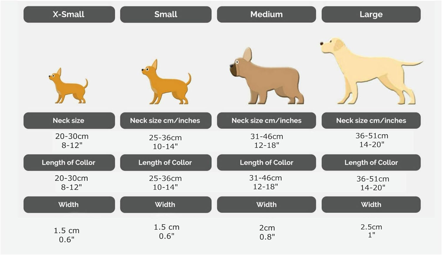 Available in extra small, small, medium and large size. Please see the size chart for details. They are fully adjustable with s strong metal d-ring to attach the leash to.