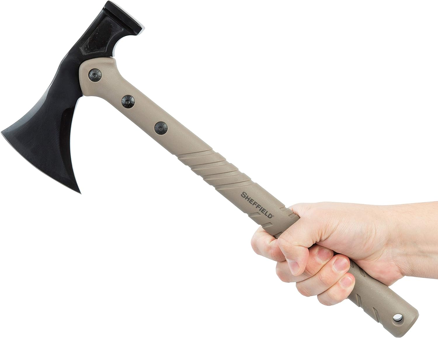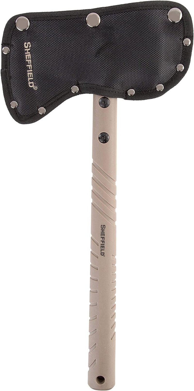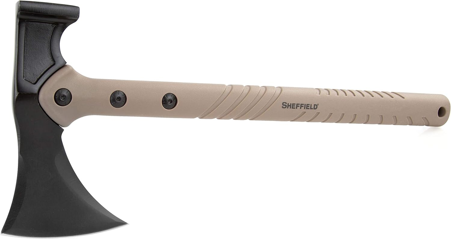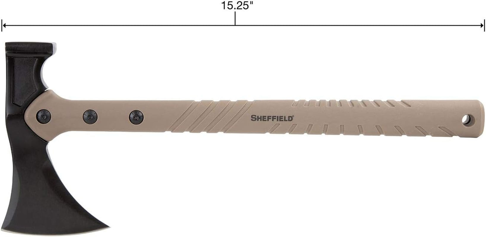 The Sheffield Armory Series Sparrow 14.5 Inch Hammer Axe gives a tactical edge when you’re out exploring the wild. Whether trekking out in the field or trudging through dense woods, the camp hatchet and double sided axe hammer offers advantage in performance and comfort in carry with its 3.5 inch black-oxide bonded blade, extra-wide hammer head, and 14.5 inch nylon-fiberglass grooved handle. An above military-grade 1680D sheath makes sure the bushcraft axe is safely stored when not hammering or chopping away. The hand axe is perfect for prolonged camping trips, bushcrafting, long hikes, mountain climbing, and more. Add this wood chopping axe to your backpacking gear or camping kit with confidence that you have a reliable, robustly useful survival hatchet and tactical hammer on your side. The versatile use, compared to other hatchets and tomahawks, gives you more to work with and less to carry, making it the ideal camping ax to transport while exploring. The camp axe with sheath can be used for self defense and dangerous survival situations. The camping hatchet hammer was built to withstand the toughest of beatings, so you don’t have to worry about the heavy duty hatchet breaking. The grip cuts on the camping hatchet with sheath are positioned for both full swings and short chops. You can trust the really sharp axe and outdoor hatchet is built to handle to toughest situations and designed to last a lifetime.