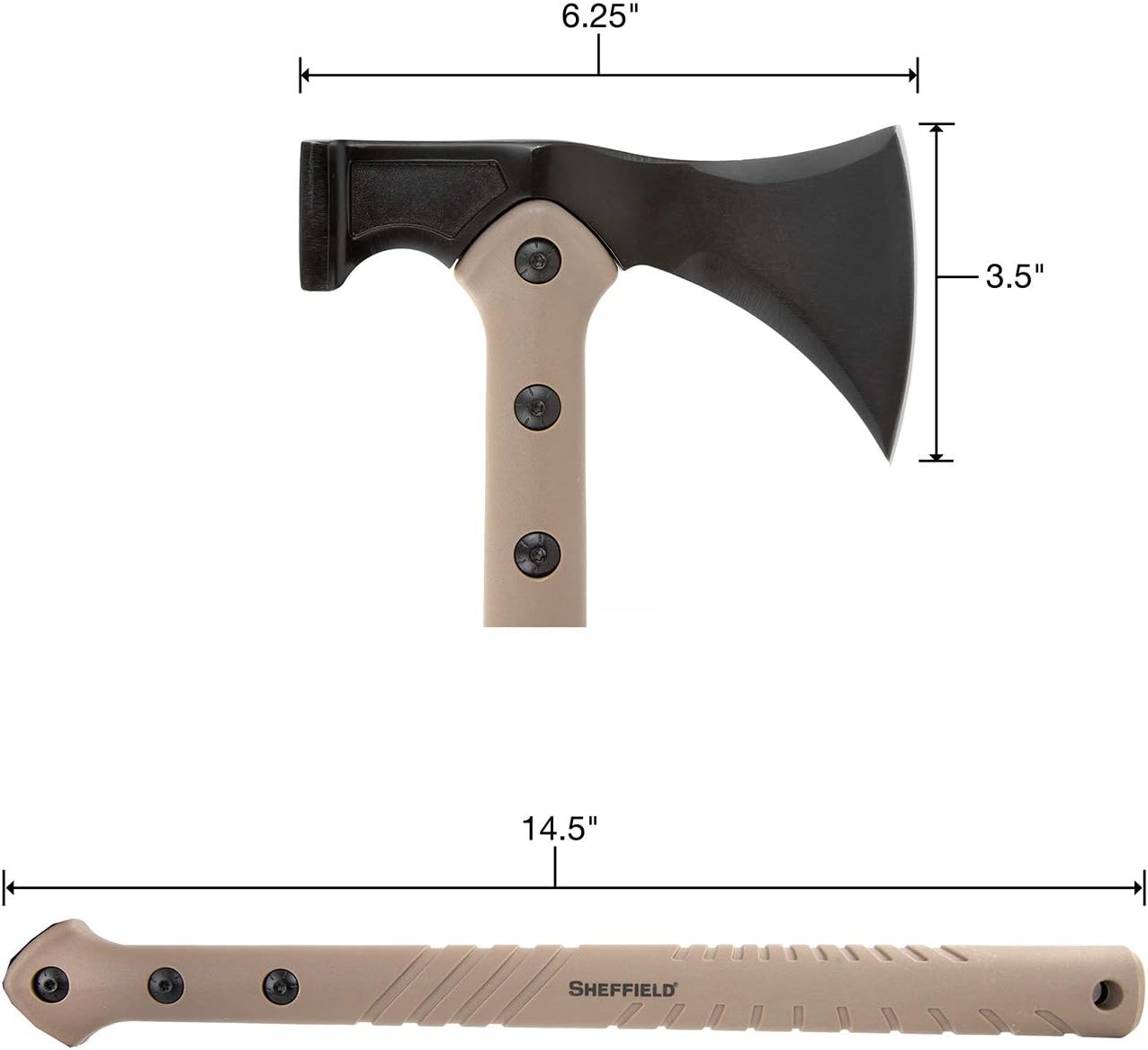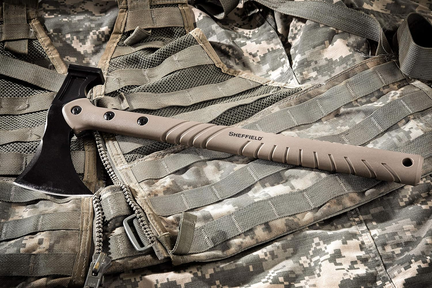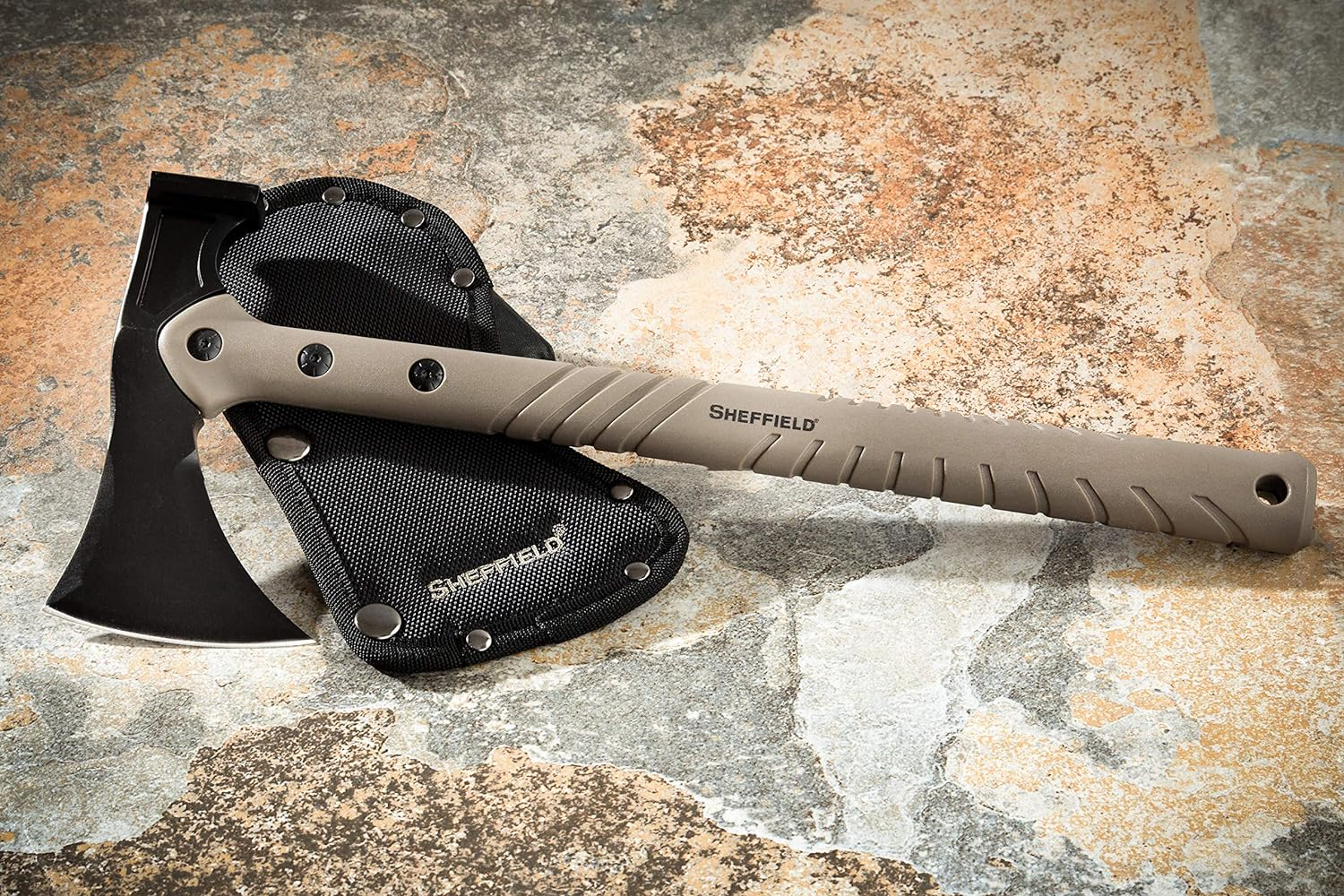 The Sheffield Armory Series Sparrow 14.5 Inch Hammer Axe gives a tactical edge when you’re out exploring the wild. Whether trekking out in the field or trudging through dense woods, the camp hatchet and double sided axe hammer offers advantage in performance and comfort in carry with its 3.5 inch black-oxide bonded blade, extra-wide hammer head, and 14.5 inch nylon-fiberglass grooved handle. An above military-grade 1680D sheath makes sure the bushcraft axe is safely stored when not hammering or chopping away. The hand axe is perfect for prolonged camping trips, bushcrafting, long hikes, mountain climbing, and more. Add this wood chopping axe to your backpacking gear or camping kit with confidence that you have a reliable, robustly useful survival hatchet and tactical hammer on your side. The versatile use, compared to other hatchets and tomahawks, gives you more to work with and less to carry, making it the ideal camping ax to transport while exploring. The camp axe with sheath can be used for self defense and dangerous survival situations. The camping hatchet hammer was built to withstand the toughest of beatings, so you don’t have to worry about the heavy duty hatchet breaking. The grip cuts on the camping hatchet with sheath are positioned for both full swings and short chops. You can trust the really sharp axe and outdoor hatchet is built to handle to toughest situations and designed to last a lifetime.