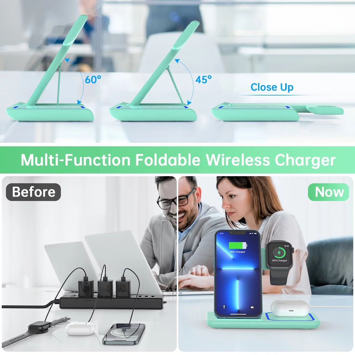- 【ANTI-SLIP DESIGN&MULTI-FUNCTION OBSERVATION】Powerful magnetic fixed, and the charging base with anti-slip silicone design so that the charger will not move or flip, to ensure that your phone is protected when charging. 3&1 wireless charger supports vertical or horizontal wireless charging with a tilt angle design for better viewing of video or tracking information while charging.